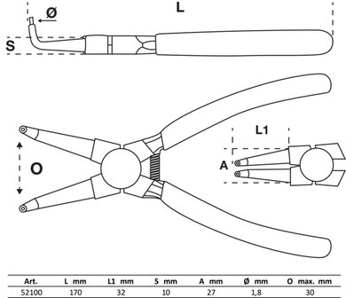 1 pinza per anelli di sicurezza esterni, angolata, 175 mm, misura di apertura mass. 33 mm