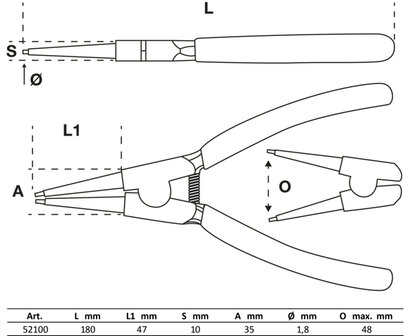 1 pinza per anelli di sicurezza esterni, dritta, 175 mm, misura di apertura mass. 35 mm